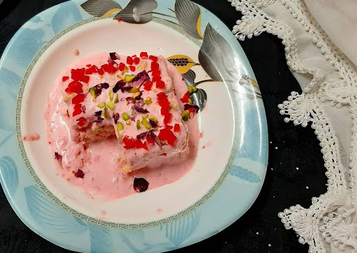 - In bowl mix fresh cream, milkmaid, milk and rose syrup and set aside (1 cup Reserve for later).Cut brown edges of bread.In dish dip the bread into rose milk mixture assembled as two layers.
